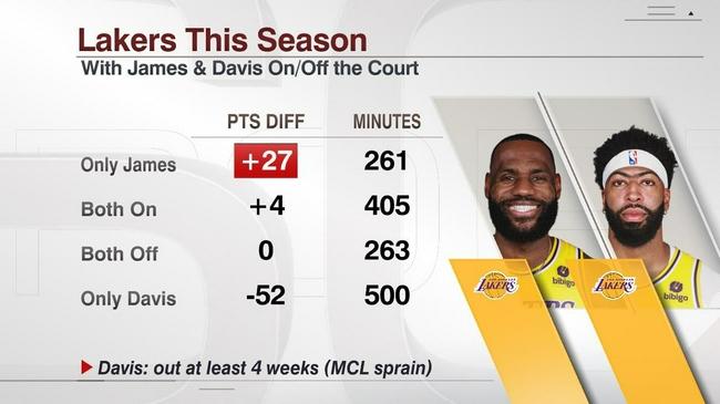 当只有詹姆斯一人带队在场时,261分钟的时间里湖人队净胜分为+27。当只有浓眉一人带队在场时,500分钟的时间里湖人队的净负分为-52。