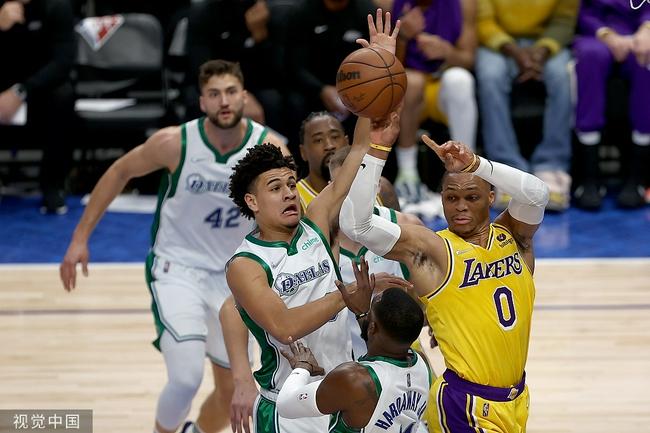 先是哈达威超远三分将比分扳平。湖人马上还以颜色,这一球竟然来自威斯布鲁克,这是他全场首次命中三分,湖人又一次超出。