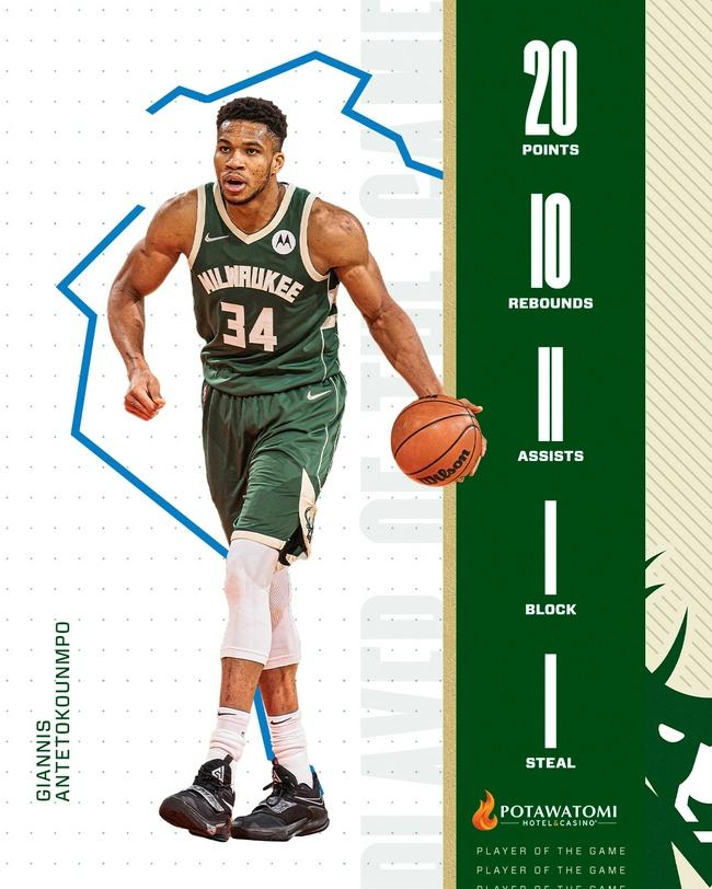 本场比赛,雄鹿当家球星扬尼斯-安特托昆博出战30分钟,16投7中,得到20分、10篮板、11助攻、1抢断和1盖帽。