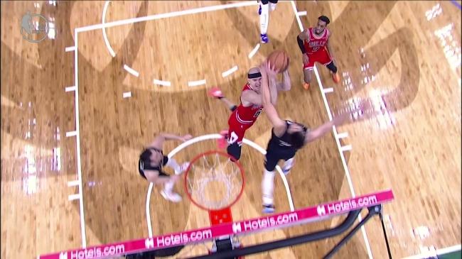 比赛进行到第三节结束前5分45秒,卡鲁索快攻中接到队友传球准备上篮,结果雄鹿防守球员格雷森-阿伦直接在空中将对手掀翻。
